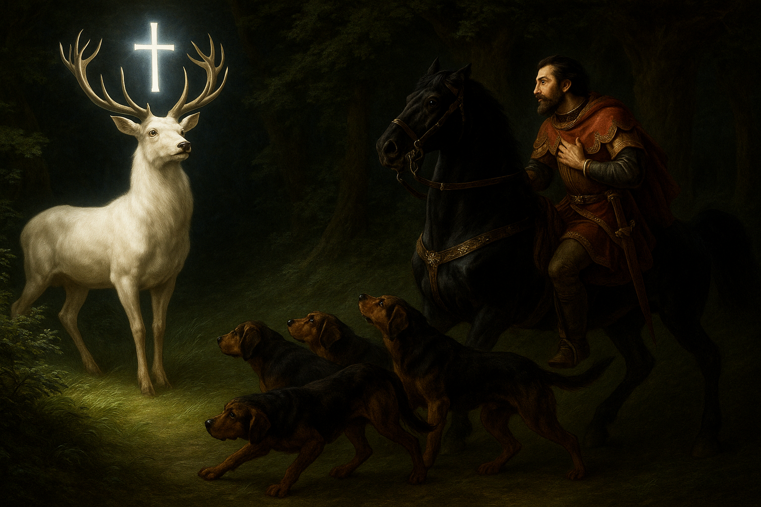 Issu d’une ancienne lignée franque, Hubert vivait dans le faste et aimait les plaisirs de la vénerie. Un Vendredi saint, il partit seul à la chasse dans les forêts profondes. Il aperçut alors un cerf d’une taille extraordinaire, entièrement blanc, dont les bois portaient une croix lumineuse. Une voix retentit : « Hubert ! Jusqu’à quand poursuivras-tu les bêtes dans les bois ? » Saisi d’effroi, Hubert se jeta à terre et demanda : « Seigneur, que veux-tu que je fasse ? » La réponse lui fut donnée : « Va auprès de Lambert, mon évêque, à Maestricht. Convertis-toi. »